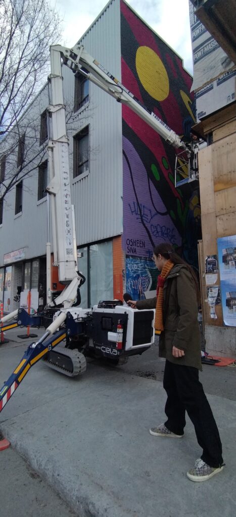 Nous sommes sur la grande avenue Saint-Laurent qui délimite l’est de l’ouest de la ville. Il est 17h51 donc on est à l’heure de pointe avec beaucoup de voitures qui circulent. Devant moi, un ouvrier opère sur un mur en hauteur grâce à une nacelle dont le moteur dégage un gros bruit.